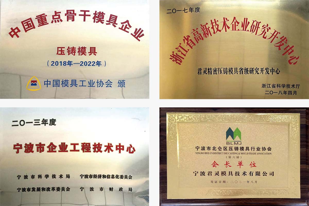 君靈模具通過多年持續(xù)發(fā)展和技術(shù)創(chuàng)新榮獲由國家工信部頒發(fā)的“專精特新”小巨人企業(yè),并連續(xù)多年榮獲中國重點骨干模具技術(shù)企業(yè)、中國壓鑄模具20強、省級研發(fā)中心、浙江省工程技術(shù)中心、浙江省信用示范企業(yè)、寧波市專利示范企業(yè)、寧波市高成長企業(yè)、北侖壓鑄模具行業(yè)協(xié)會會長單位等榮譽稱號。